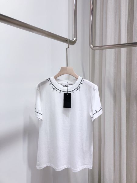 women's spring counter style collar sleeve embroidery vintage pattern design round neck short sleeve two-color spot hair, White