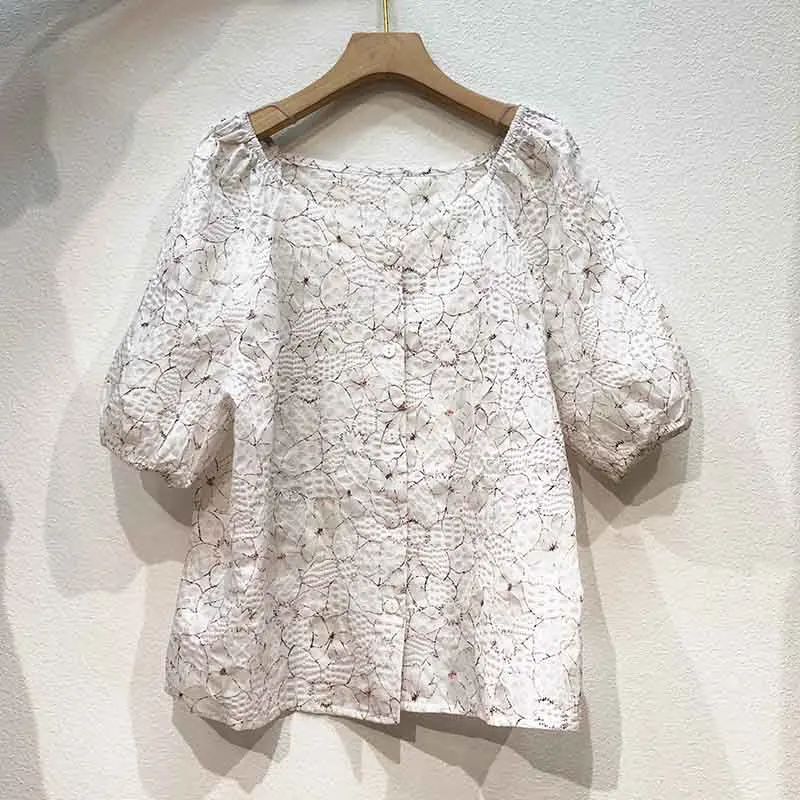 Новый жаккардовый хлопковый Свободный Топ с V-образным вырезом и рукавами-фонариками