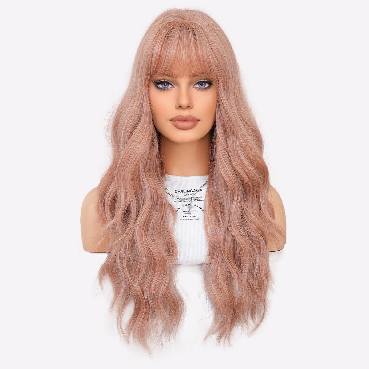 Парик TikTok Viral Rose Gold Balayage - 26-дюймовые термостойкие вьющиеся волосы с прямой челкой, естественные синтетические свободные волны для повседневного использования и вечеринок 68cm 26 inch розовый