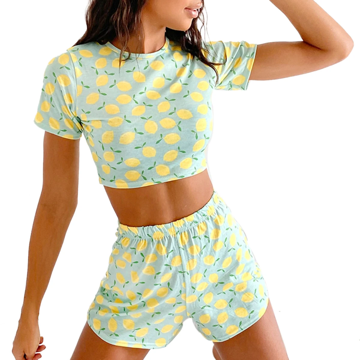 Новый женский пижамный комплект из двух предметов, короткий топ с принтом, открытый пупок, шорты с высокой талией, ночная одежда с коротким р...
