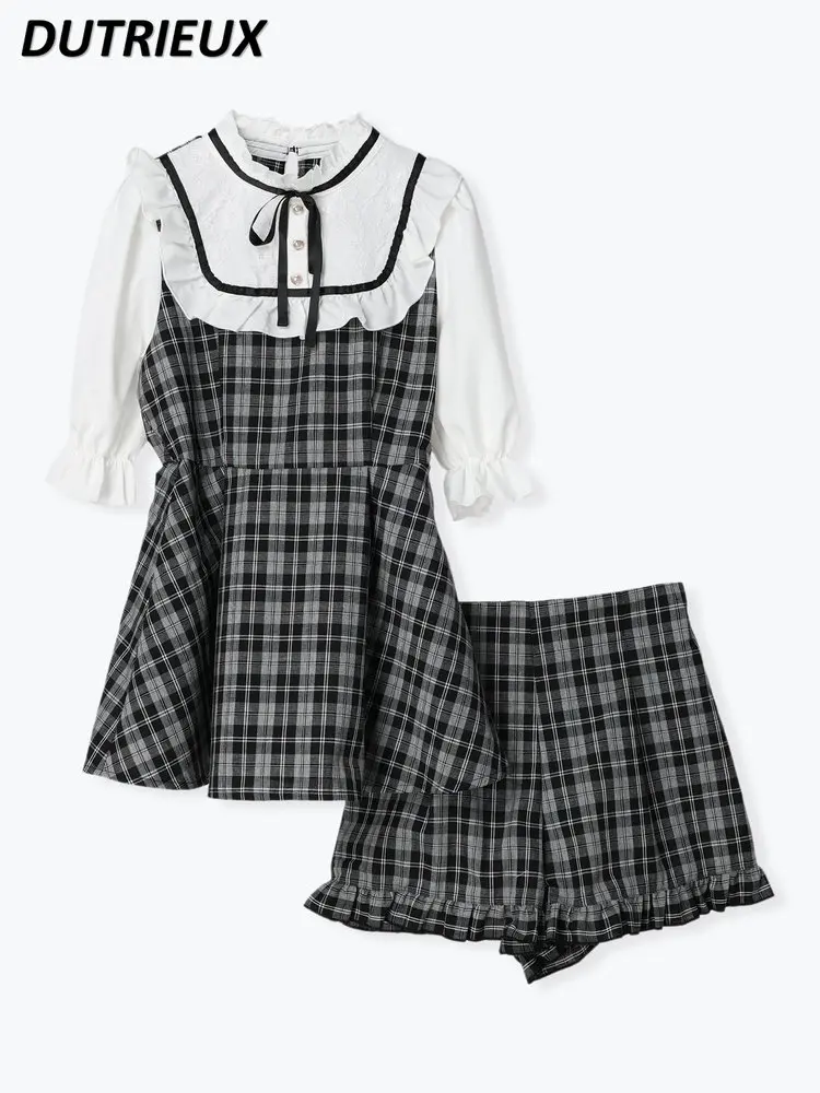 Новый женский пуловер с круглым вырезом и коротким рукавом, кружевное милое платье с круглым вырезом + шорты, милый костюм для девочек, комплект из двух предметов