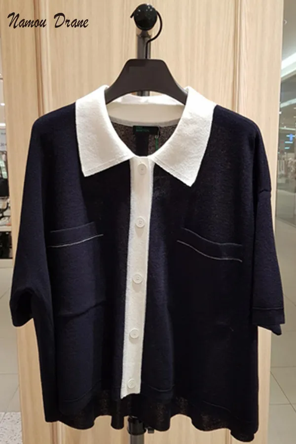 Dongdaemun Летний Новый Стиль временной ряд контрастные цвета лоскутный Po0o воротник топ с U-образной пряжкой короткий рукав трикотаж