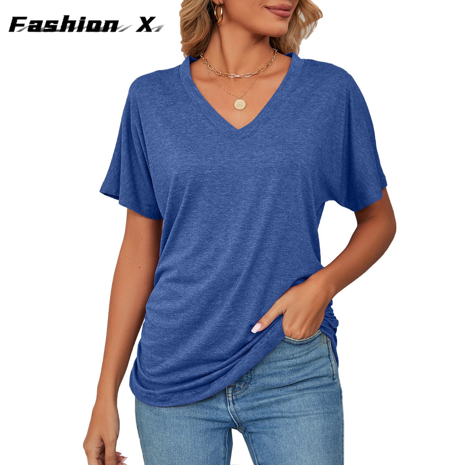 Новый летний повседневный пуловер с v-образным вырезом, однотонная свободная футболка, женские топы 2XL