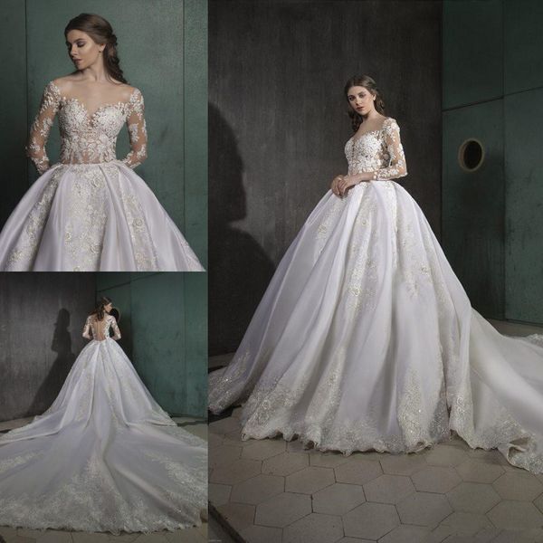 2020 new vintage long sleeve wedding dresses chapel train lace bridal gowns sheer neck saudi arabic plus size wedding dress custom, White