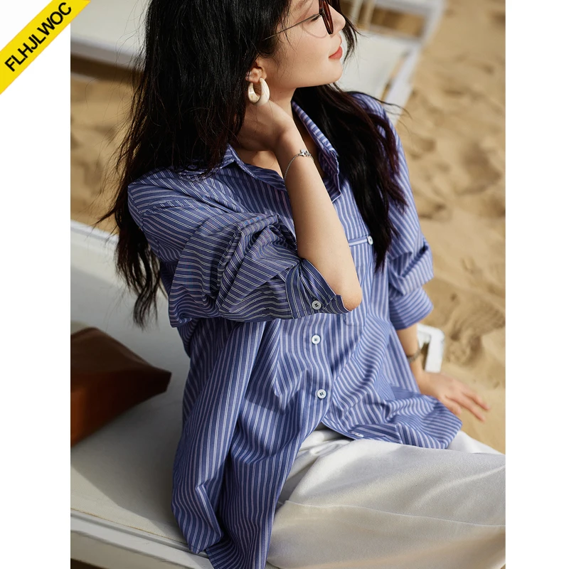 Blue Striped Tops Blouses 2025 Spring Summer Long Sleeve Girls Preppy Style Loose Boyfriend Design Casual Basics Button Shirts
