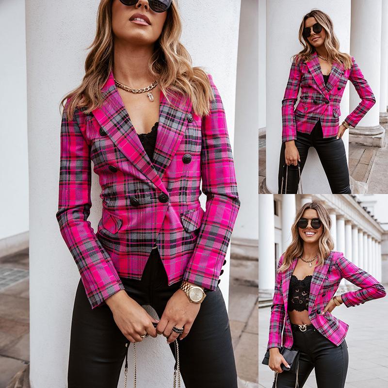 Women's Suits & Blazers ZXQJ Women 2022 Fashion Tweed Double Breasted Blazer Coat Vintage Long Sleeve Flap Pockets Female Outerwear Chic Top, As picture