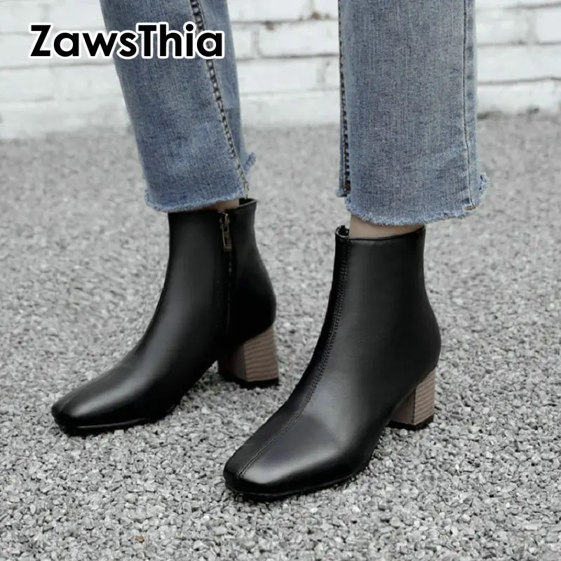 Женские Классические ботильоны ZawsThia, черные или хаки полусапожки на высоком массивном каблуке с квадратным носком, большие размеры 33-51, зим...