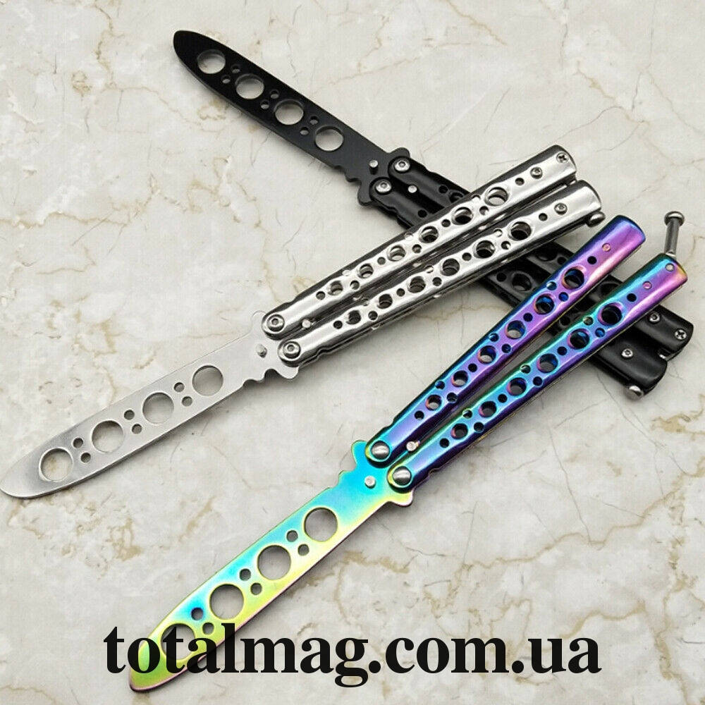 Не является холодным оружием.(Хоз.Быт). Анодирование поверхностей ножа имитирует цвета побежалости стали, которые возникают при окислении, в результате термической обработки металлов. Обработка при помощи анодирования придает ножу яркий, необычный вид и обеспечивает дополнительную защиту от коррозии и ржавчины. Балисонг обладает легкостью трансформации из сложенного вида в рабочий, чем способствует простой и надёжный механизм. Бабочка хорошо подходит для флиппинга и других трюков, которые обычно проделывают с ножами такого типа, это не просто приятная игрушка, но и аксессуар, развивающий моторику.