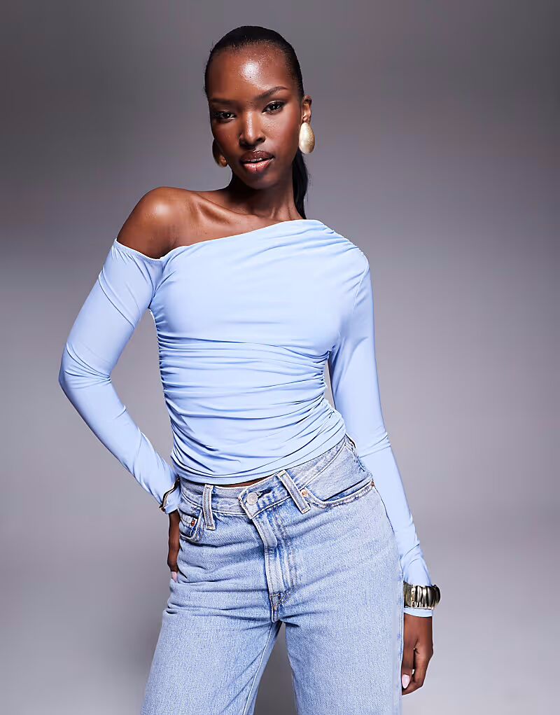 Эксклюзивный двухслойный облегающий топ Kaiia с открытыми плечами и длинными рукавами нежно-голубого цвета