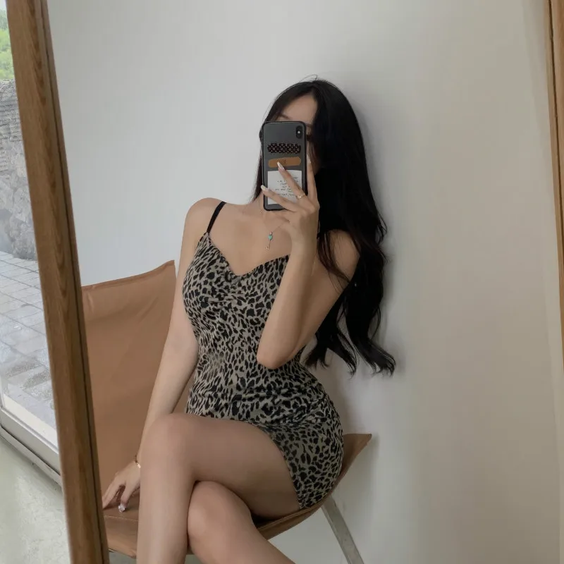 2021 spring and autumn new leopard print dress women's slim waist slimming temperament autumn short skirt suspender skirt