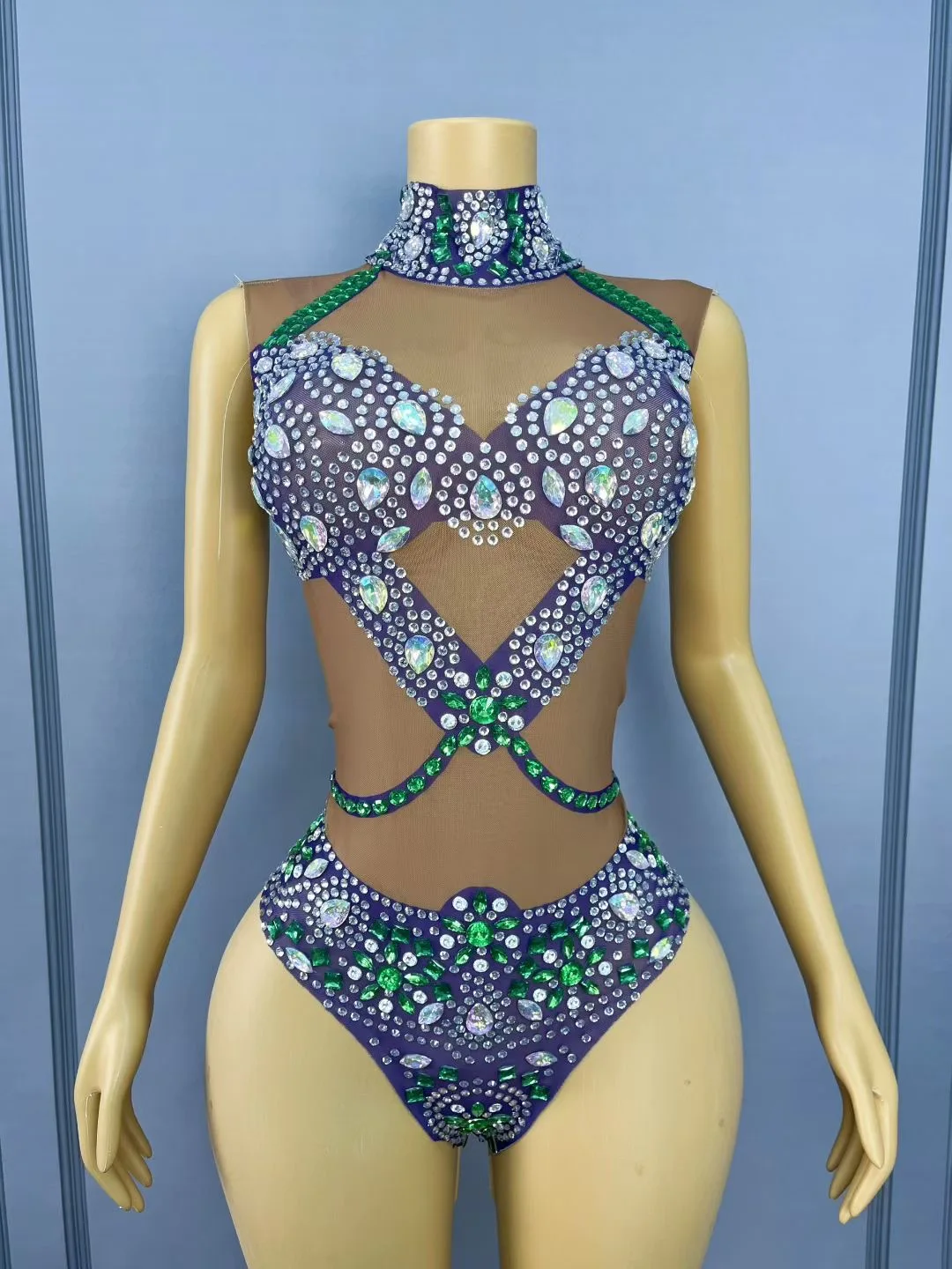 Luxury Rhinestone Women Sexy Sleeveless Mesh See Through Bodysuit Nightclub Performance Stage Outfit Birthday Party Wear