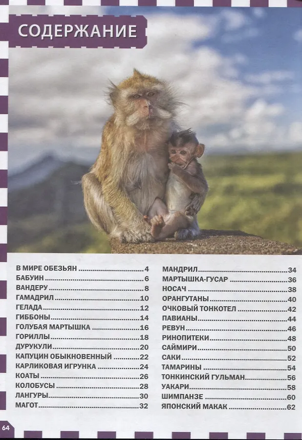 "Обезьяны" - это книга о самых близких "родственниках" человека среди животных: умных, забавных, ловких и сильных приматах. На страницах нашей энциклопедии вы узнаете, чем питаются громадные гориллы, какие обезьяны лучше всех "летают" с ветки на ветку, как общаются мартышки и почему ревуны боятся воды, познакомитесь с шумными шимпанзе и ловкими саки, грозными павианами и молчаливыми уакари.
