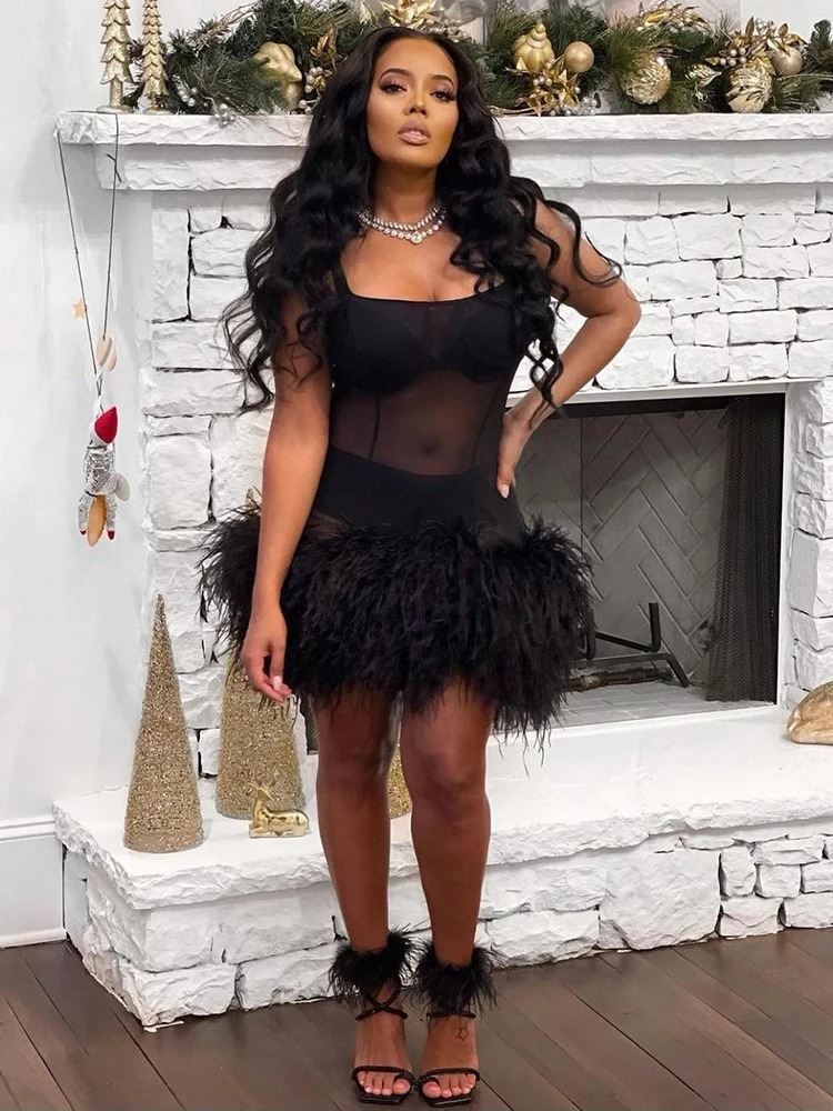 Облегающее Сетчатое Прозрачное мини-платье на бретельках с открытой спиной и перьями
