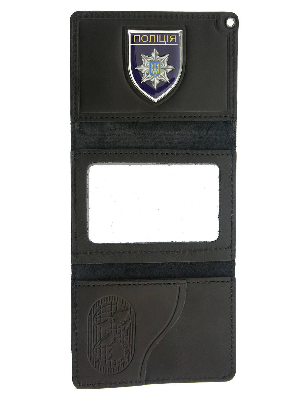 Розкладається обкладинка для посвідчення працівників поліції вертикально, відкриваючи три відділи. По центру розташовується прозоре пластикове віконце. З боків Ви бачите два шкіряних кишені: один - великий, другий - обрізаний, із зігнутим краєм.