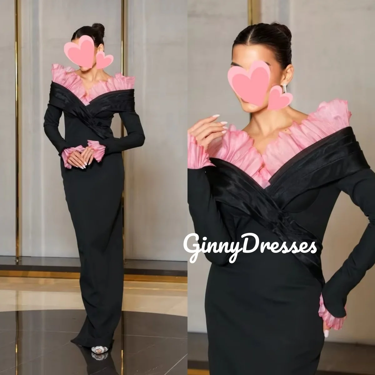 Оболочка Черно-Розовый Вечернее платье по индивидуальному заказу Платья длиной до пола с открытыми плечами для особых мероприятий с рюшами и длинными рукавами на молнии
