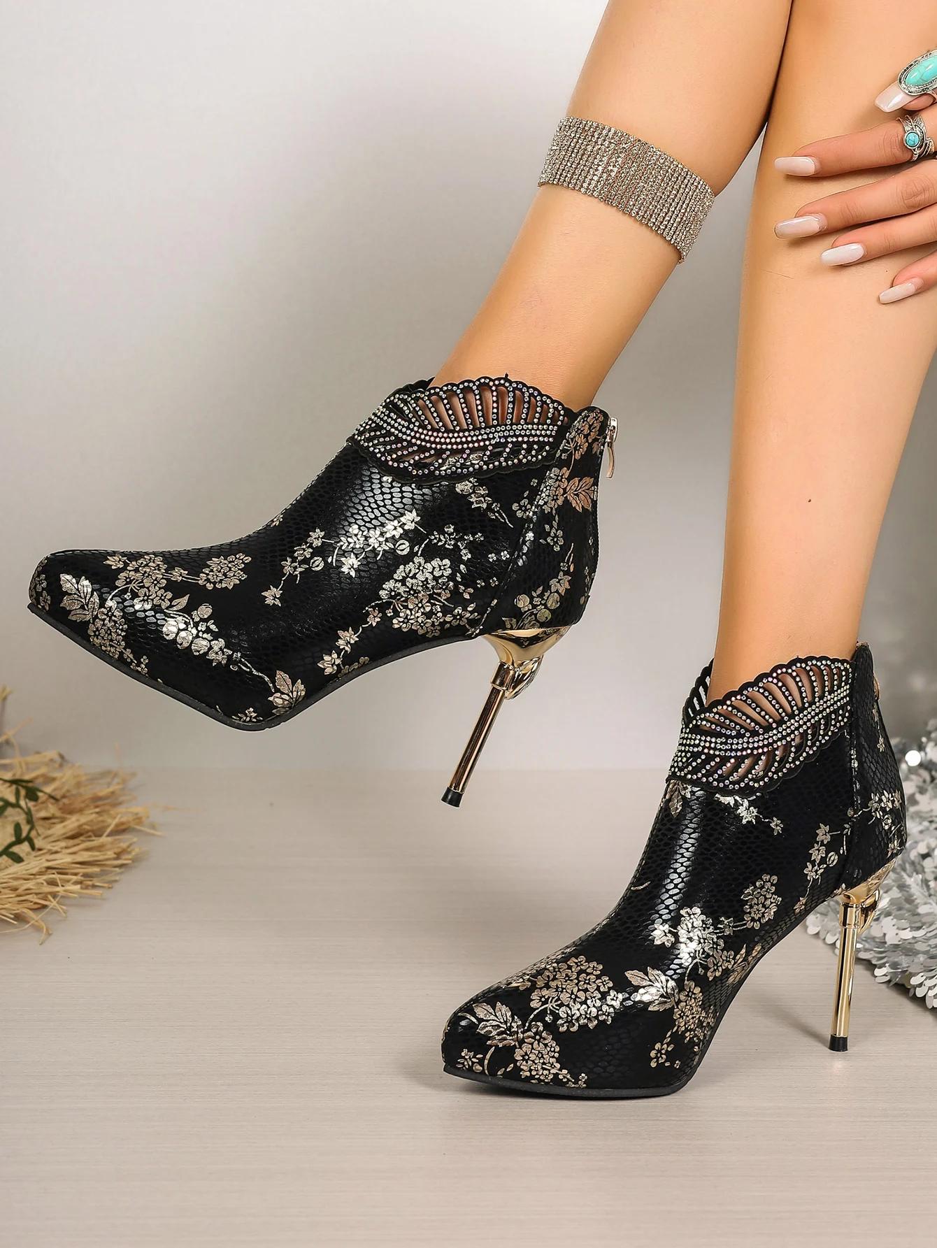 Обувь женская 2024 новые женские сапоги с застежкой-молнией сзади модные печатные офисные и карьерные сексуальные ботильоны с острым носком на тонком каблуке со стразами 43 чёрный