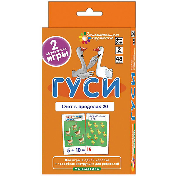 Набор карточек «Математика 2 Гуси, Счет в пределах 20» состоит из 48 карточек, которые могут использоваться с двух сторон. С помощью набора ребёнок научится складывать и вычитать числа в пределах 20, а также отработает навык устного счёта.