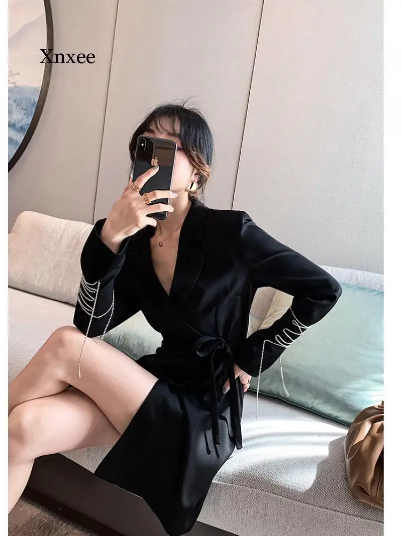 Black Blazer Dress Lace Up Bodycon Long Sleeve Diamonds Chain Office Ladies Jacket Female Outfit New Autumn Clothing