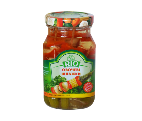 Овощи (початки кукурузы, огурцы маринованные, лук маринованный, перец сладкий красный) и шампиньоны в переменной пропорции, вода питьевая, сахар, соль, кислота молочная.