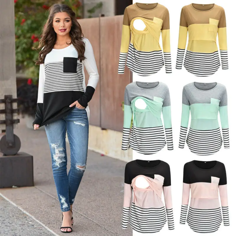 Одежда для беременных и кормящих женщин топы для кормящих матерей полосатая футболка для кормящих мам с длинным рукавом S/M/L/XL/XXL