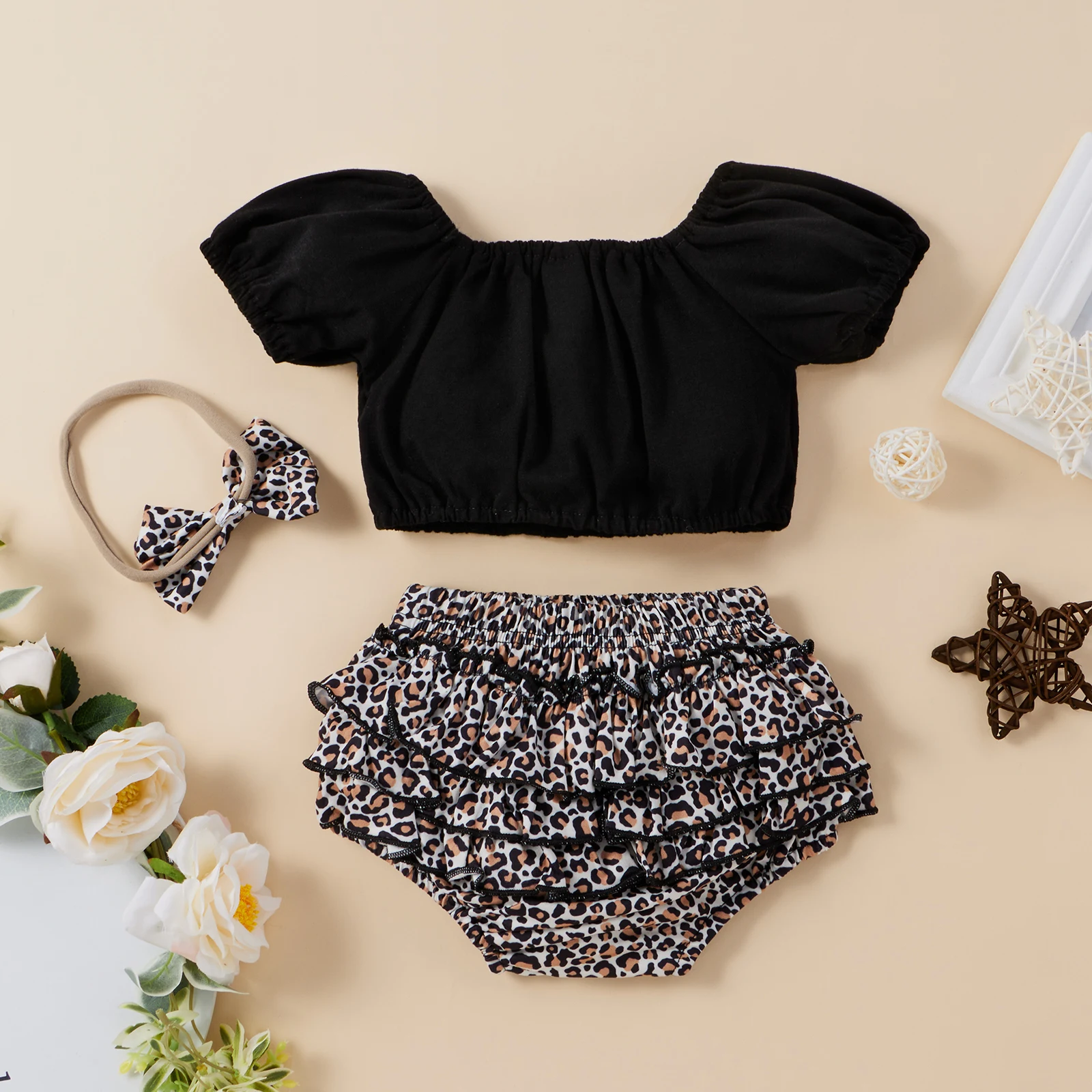 Одежда для девочек, комплект детской одежды из 3 предметов для однотонные Цвет топ с короткими рукавами с леопардовым принтом, комплект с мн...