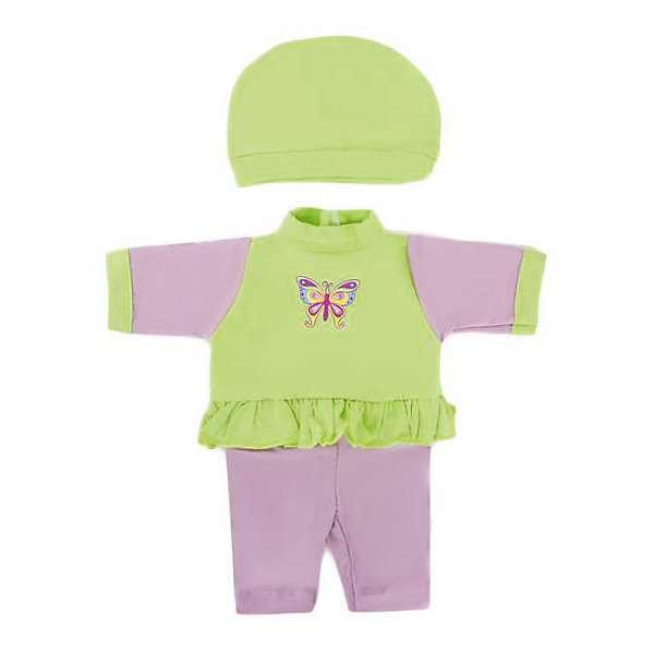 В наборе девочки найдут комбинезон и шапочку. Комбинезон с воротничком-стойкой и длинными рукавами пошит в сочетании серого и салатового цветов, украшен принтом с изображением бабочки на груди и рюшей. Одежда отличается реалистичным дизайном и продуманным кроем, она полностью имитирует одежду для малышей.