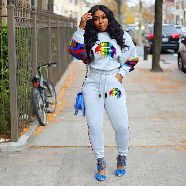 tracksuits long sleeve pullover womens 2pcs set casual womens apparel new arrival lips printed womens, Gray