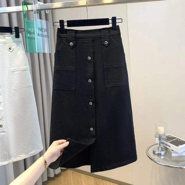 Однобортная джинсовая юбка средней длины с эластичной резинкой на талии, женская юбка-трапеция с разрезом на весну и лето, женская одежда больших размеров XXL чёрный