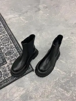 Vibsterimma New 2019 Black Leather Detail Ankle Boots Women Genuine Leather Booties High Quality Martin Flat Biker Boots