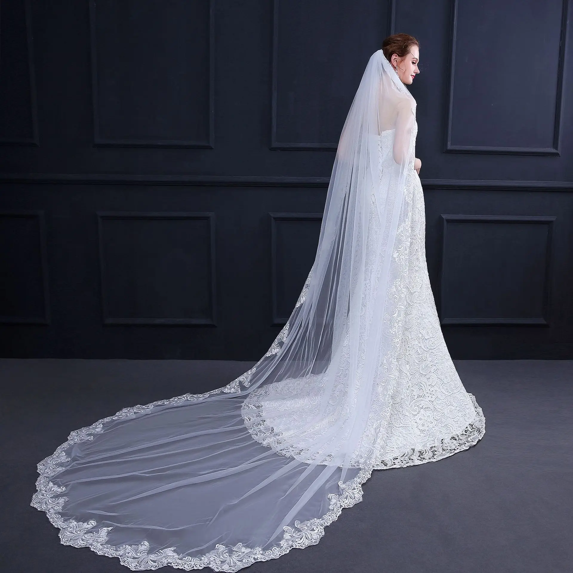 Однослойная свадебная фата длинная Изысканная кружевная вышитая кружевная шлейф длиной 3 метра