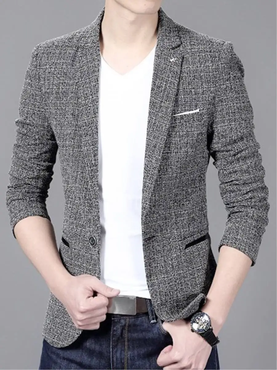 Однотонная мужская приталенная деловая повседневная куртка на одной пуговице с отложным воротником