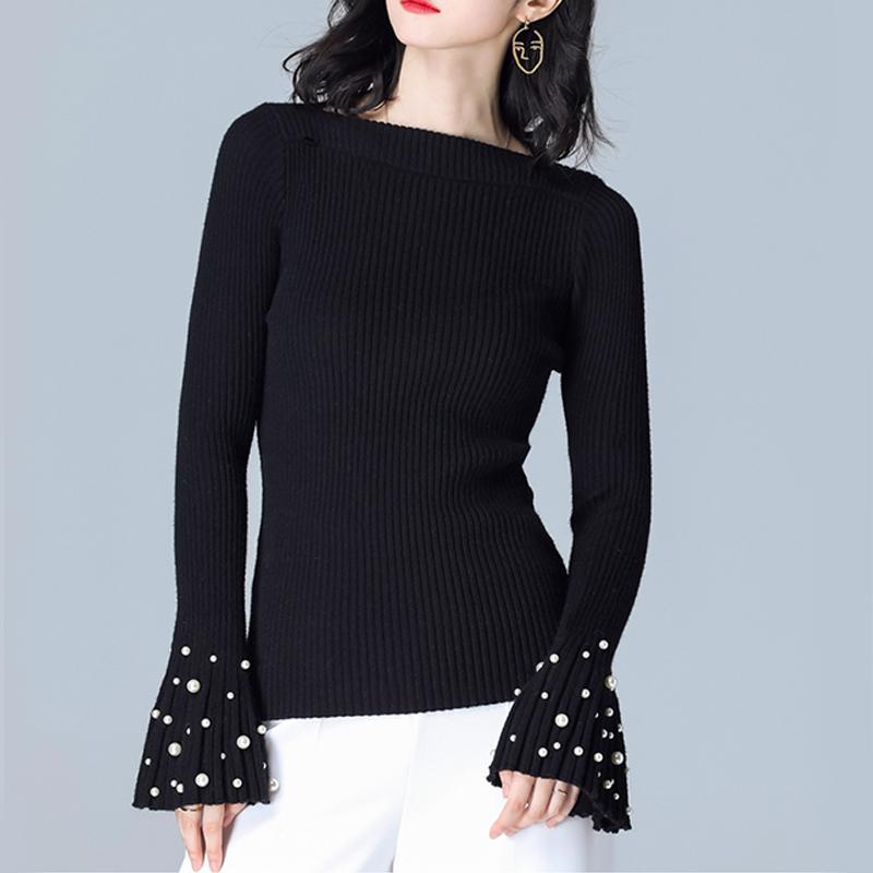 Однотонная расклешенная зимняя одежда с длинными рукавами, женский пуловер, свитер, новинка 2023 года, весенний корейский вязаный свитер, вязаный свитер с бисером XL чёрный