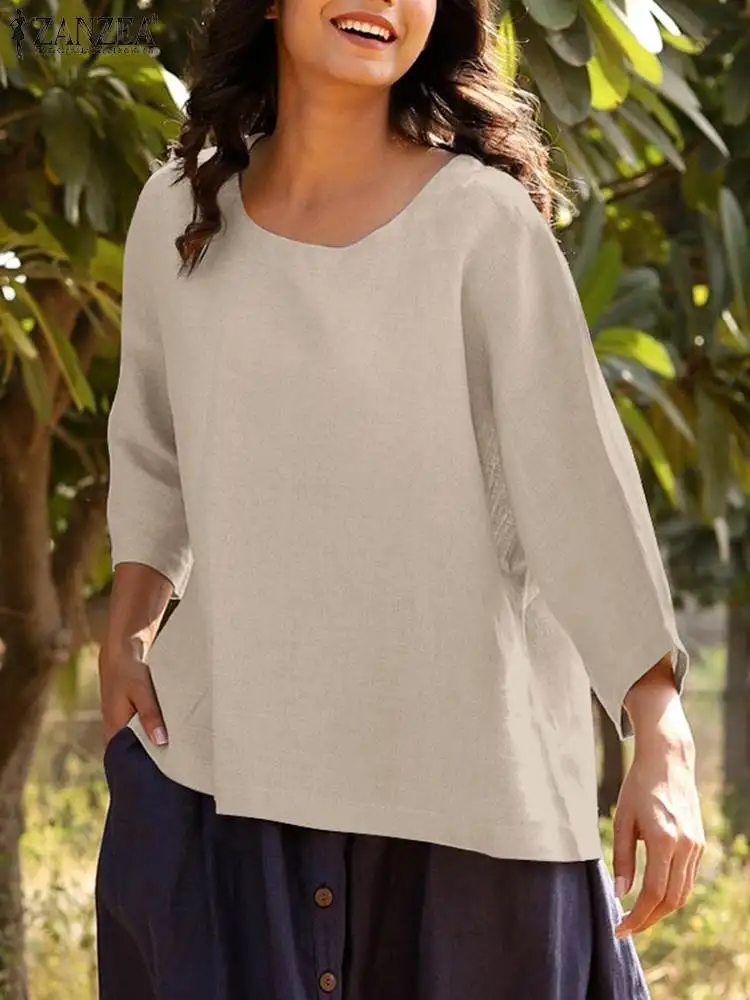 Однотонная рубашка ZANZEA с круглым вырезом и рукавом 3/4, Женская хлопковая блузка, женские повседневные Элегантные Топы, летняя свободная тун...