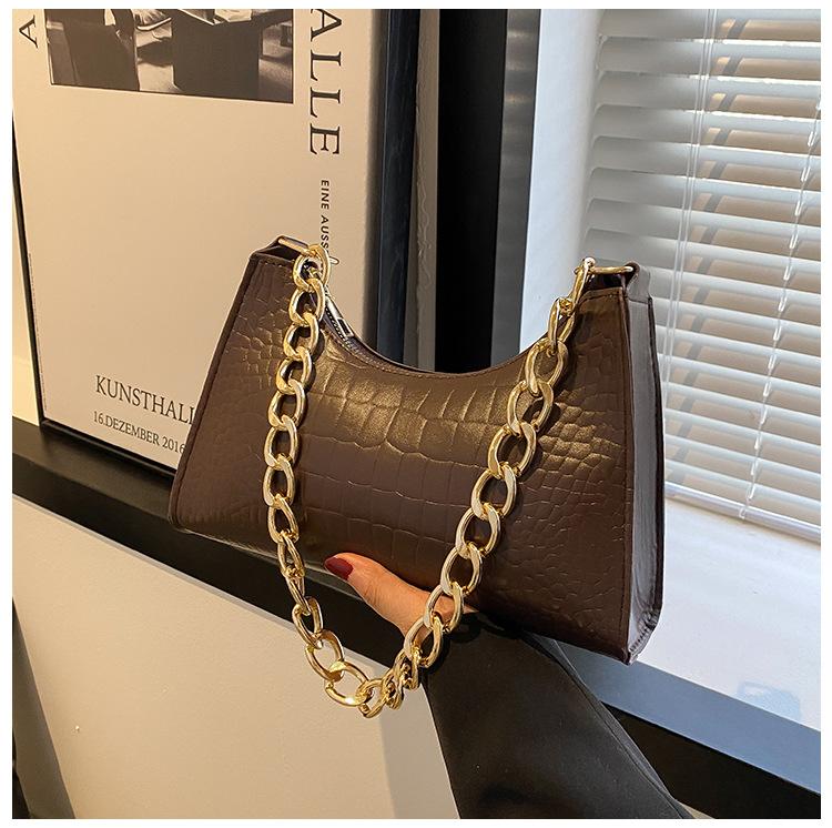 Однотонная сумка-багет в стиле ретро с цепочкой, 2025 новая весенняя модная модель, иностранный стиль, простая повседневная плечевая маленькая квадратная сумка темно-коричневого