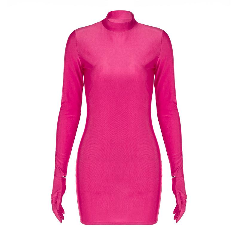 Однотонное мини-платье с длинным рукавом и перчатками, облегающее сексуальное уличное платье для вечеринок, полуводолазка, наряды Y2K, оптовая продажа L флуоресцентный розовый