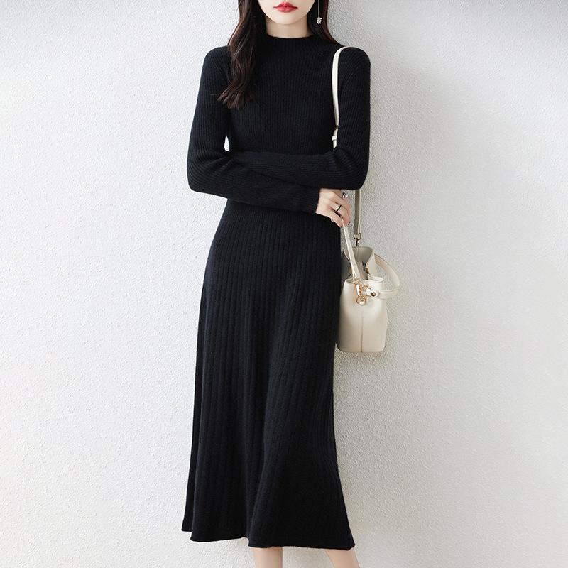 Однотонное тонкое трикотажное платье с полувысоким воротником, женское осенне-зимнее, новое, с темпераментом, элегантное, на подкладке, свитер, длинное платье One Size чёрный