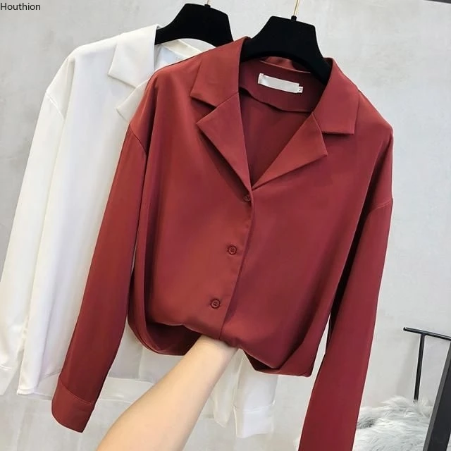 Однотонные женские шифоновые блузки Houthion, летняя Модная ретро-блузка, новинка, корейский Топ с длинным рукавом, двубортная рубашка, женские ...