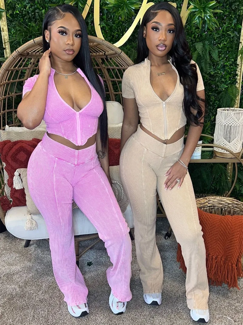 Однотонные спортивные костюмы из хлопка в рубчик, топы с коротким рукавом на молнии + брюки-клеш с высокой талией, повседневные Костюмы