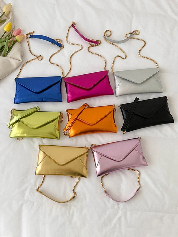 Однотонные сумки с перламутровым покрытием для женщин, модная Флип-сумка с металлической цепочкой в форме конверта, мини-сумка, новинка 2023, женская одежда в стиле High Street Chic