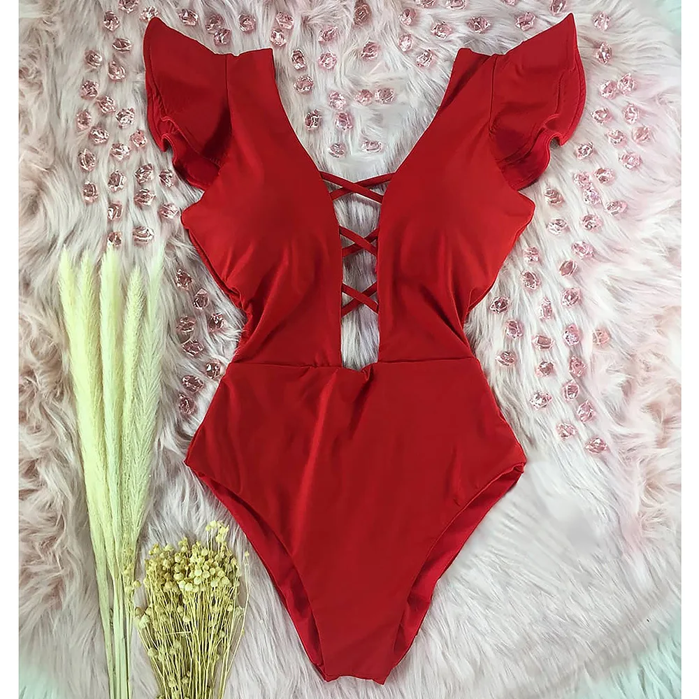 Однотонный бандажный купальник с глубоким V-образным вырезом и перекрестными лямками на шее, слитный костюм, женский купальный костюм, секс...