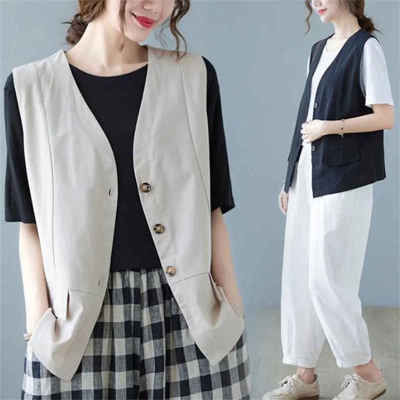 Однотонный жилет из хлопка и льна, однобортный женский Свободный жилет с V-образным вырезом