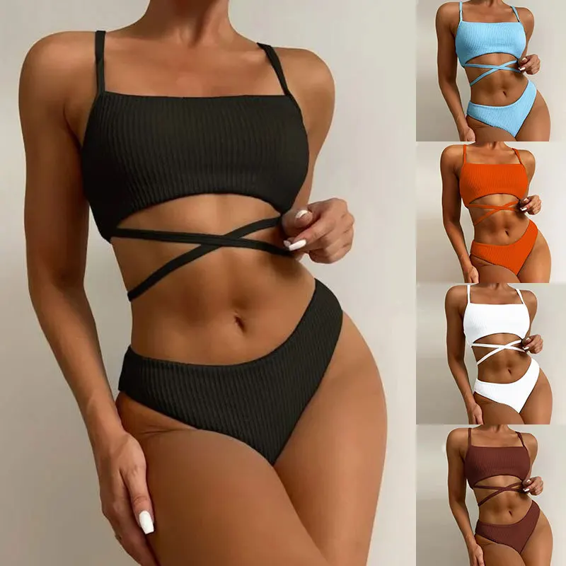 Однотонный купальник из 2 частей со шнуровкой и высокими штанинами