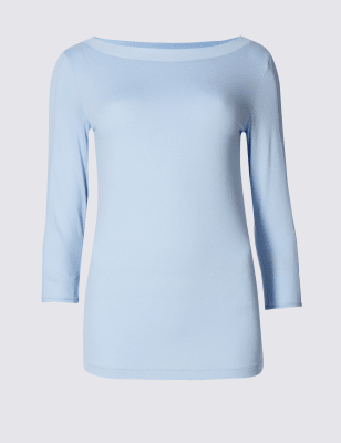 Однотонный трикотажный топ с горловиной-лодочкой и вставкой на рукаве, Свежий голубой
