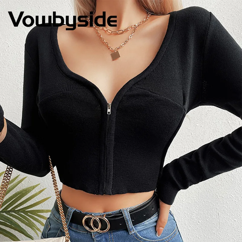 Однотонный трикотажный топ с длинным рукавом и молнией спереди