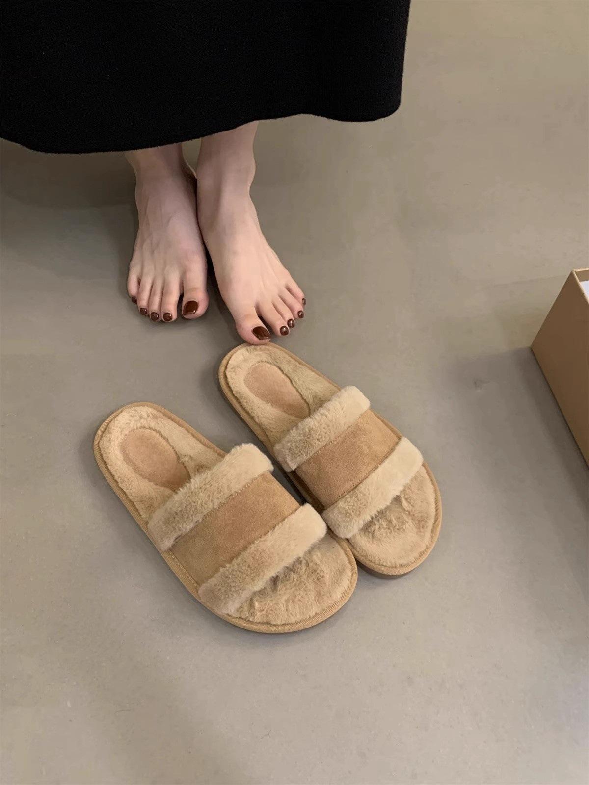 Одно слово в стиле ретро, пушистые тапочки для женщин, которые можно носить на улице 2024 года, осень-зима, новый нежный темперамент феи, плоская подошва, бархат, полудрагоценный 40