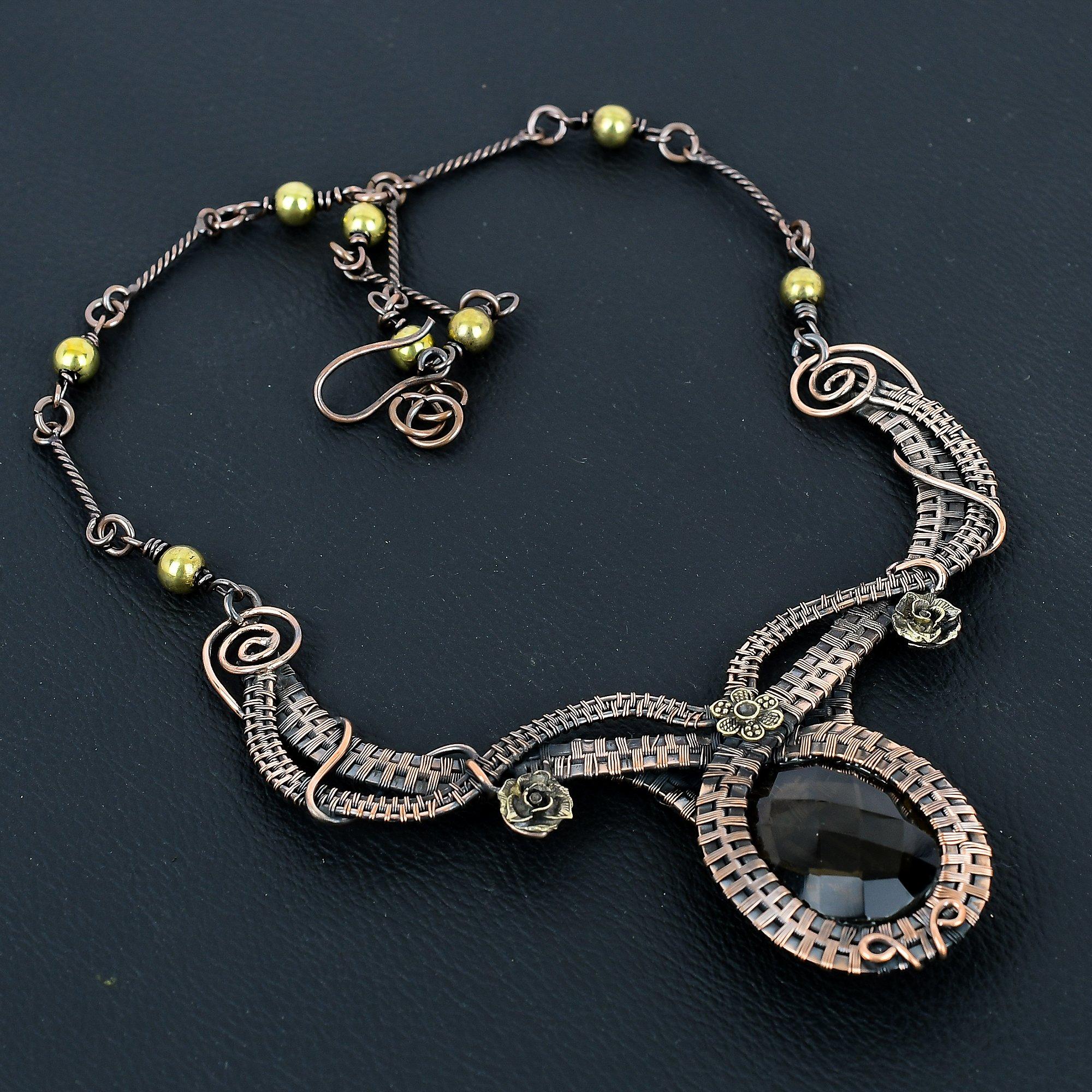 Ожерелье из дымчатого топаза Ручная работа, Ожерелье, обернутое медной проволокой 999 пробы, Дизайнерское украшение с драгоценным камнем, Ожерелье с регулируемой цепочкой, Подарок для мамы
