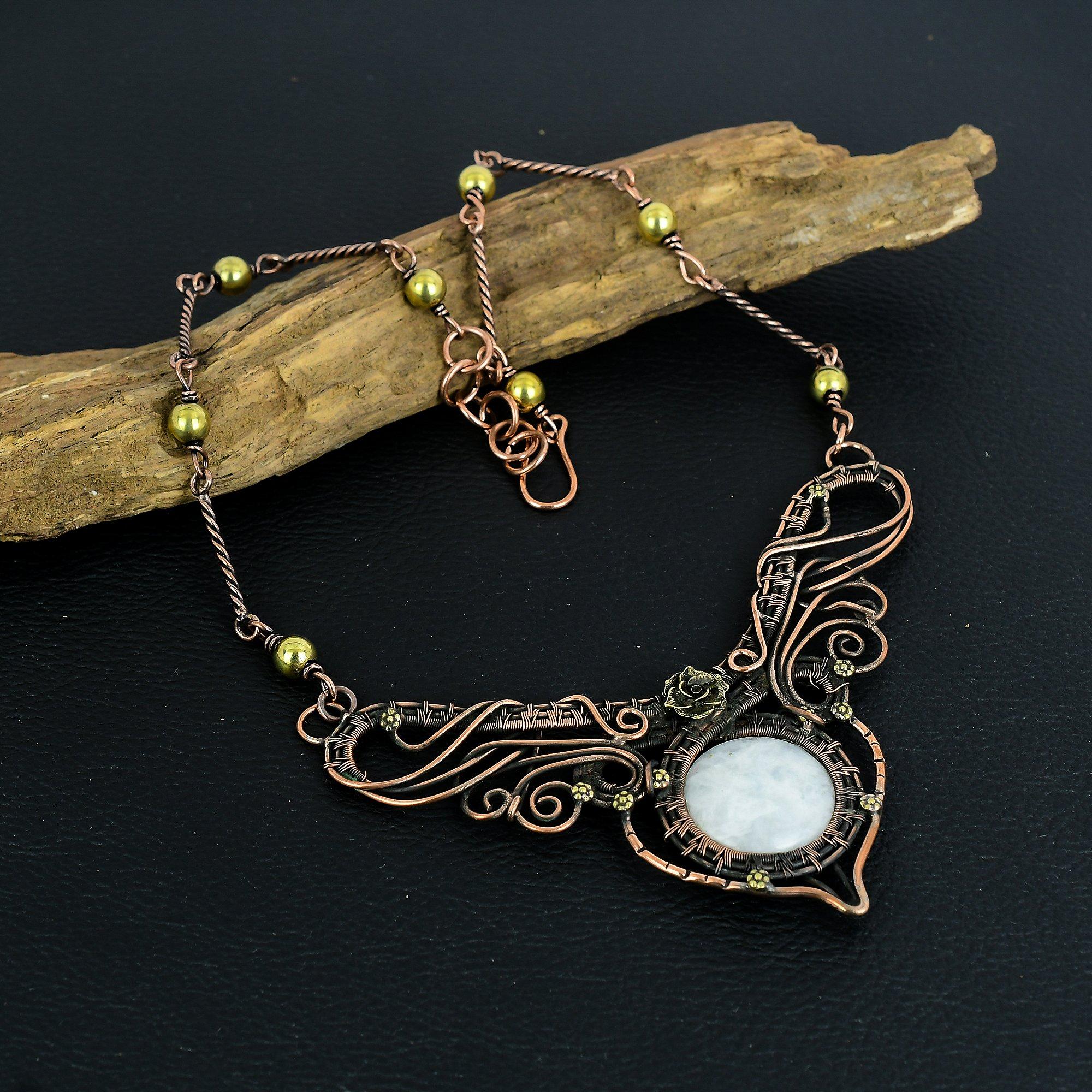 Ожерелье из радужного лунного камня, ювелирное изделие с драгоценным камнем, ожерелье с обмоткой из медной проволоки 999 пробы, регулируемое, ручной работы, красивая ювелирная цепочка-ожерелье