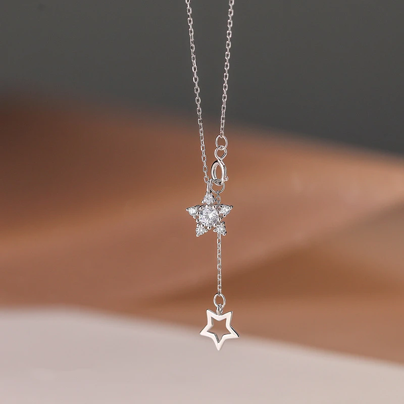 Ожерелье из серебра 925 пробы с инкрустированным цирконом и пятиконечной звездой, двойная подвеска, цепочка до ключиц для женщин, простое мод...