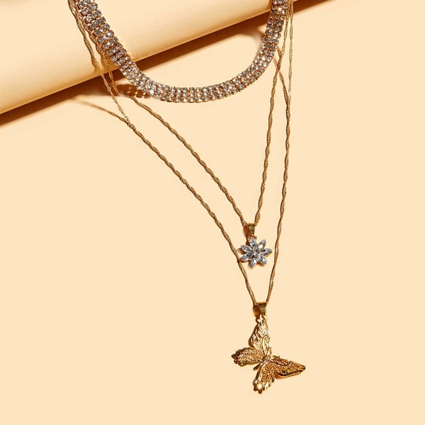 Ожерелье со стразами, подвесками цветка и бабочки 2шт, Золотистый
