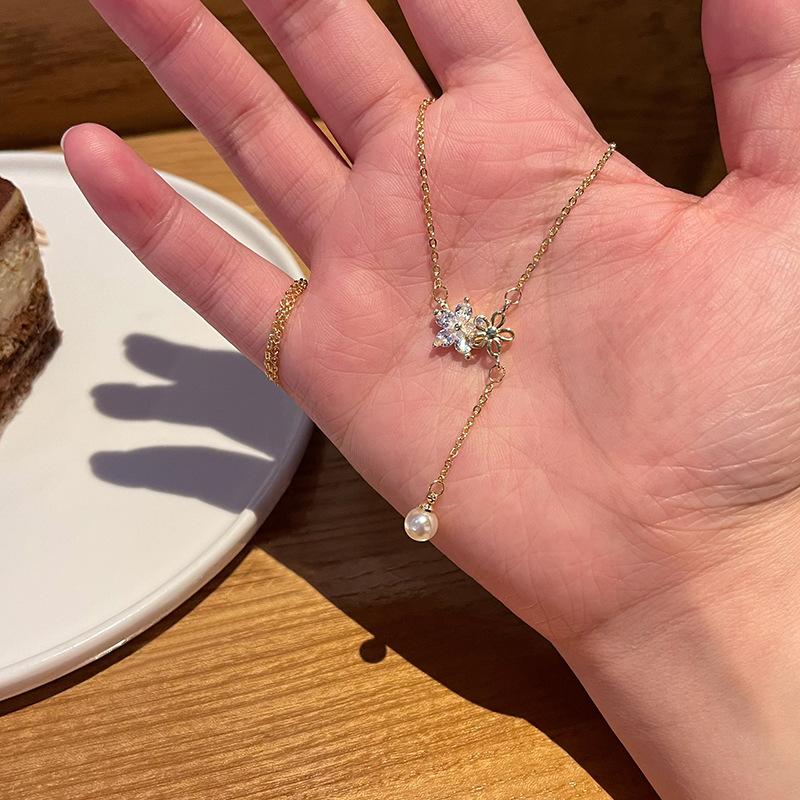 Ожерелье с кисточкой и цветущей вишней, женственность, простота, мода, искусственный жемчуг, цветок, нержавеющая сталь, цепочка на ключицу, легкая роскошь